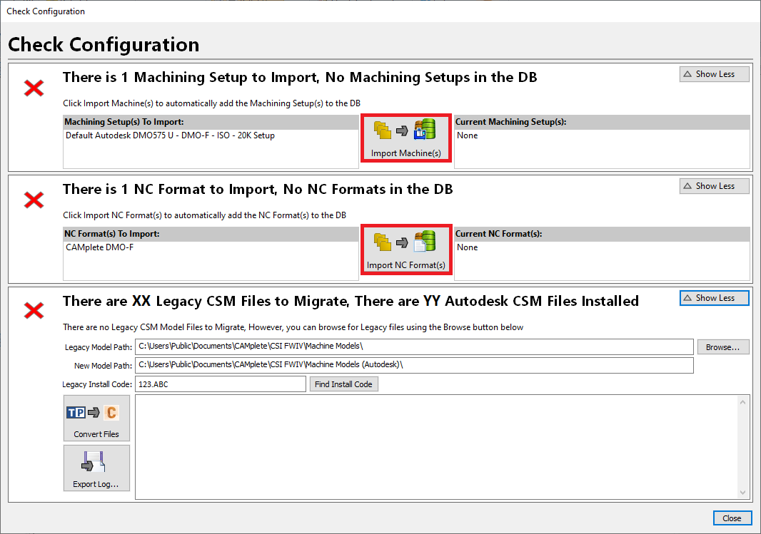 To import any un-imported machines or NC Formats, click Import Machines and Import NC Formats.