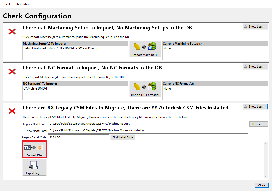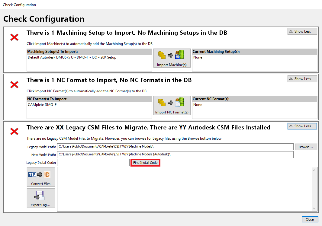 Before following the steps below, plug your legacy CAMplete USB security dongle into the computer. The dongle is only required for converting the machine files and can be removed from the computer after the process of converting machine files is complete.